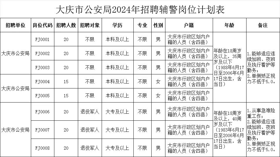 此次公開招聘輔警共計150人,具體招聘崗位、人數(shù)、條件等詳見《大慶市公安局2024年招聘輔警崗位計劃表》(附件1)。