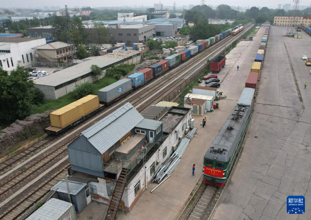 6月30日,北京至阿塞拜疆巴庫(kù)的跨里海中歐班列停靠在位于北京市房山區(qū)的北京國(guó)際陸港等待發(fā)車(chē)(無(wú)人機(jī)照片)。